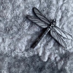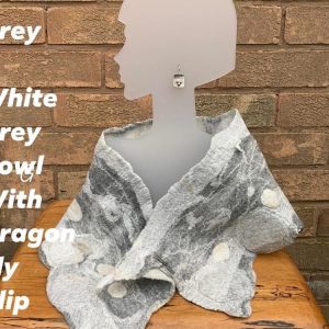 This delicate gossamer light felt stoles is made from ultra fine merino, the finest and softest wool in the world combined with fine habotai silk, chiffons and organza.  It is an unique rich and luxurious felted scarf , both warm and stylish that lifts any outfit. Each scarf comes with a stick pin made by It’s Alchemy exclusively for Fiery Felts from vintage china. This scarf is 101 cm long , 26 cm wide at is widest and 10 cm at its narrowest and weighs an astonishingly light 46g